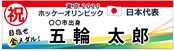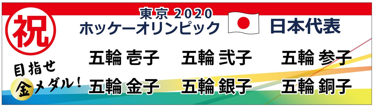競技を変えれば全競技でいけるデザインです。オリンピックはルールが厳しくて、ロゴやマークを入れることはできないので、オリンピックをイメージできるように5色をつかって華やかにオリジナルデザインです。選手肖像や所属企業名、団体名なども規約にひかかりますので注意が必要です。